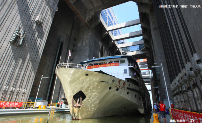 盛水承船廂是運(yùn)載船舶升降過(guò)壩的載體。3.5米標(biāo)準(zhǔn)運(yùn)行水深的承船廂總重是1.55萬(wàn)噸,根據(jù)阿基米德定律,船只駛?cè)氤写瑤麜?huì)排出同等重量的水,承船廂依舊保持在1.55萬(wàn)噸。由于運(yùn)用物理學(xué)平衡原理在船廂兩側(cè)設(shè)置了同等質(zhì)量的配重,提升或者放下承船廂,驅(qū)動(dòng)機(jī)構(gòu)僅需克服不平衡質(zhì)量和運(yùn)動(dòng)阻力(約提升400噸左右重量的力,相當(dāng)于承船廂總重的2.5%左右),船廂即可輕松升降。