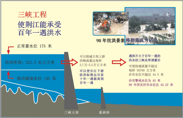 如果沒有三峽工程,荊江河段若遭遇類似歷史上出現過的1860、1870年特大洪水,兩岸堤防將潰決,洪水直趨洞庭湖,淹沒江漢平原,直接危及武漢市和京廣鐵路的安全,沖毀沿線鄉村、城鎮和工礦企業,勢必造成大量人員傷亡和巨大經濟損失。為了消除中華民族的心腹大患,因此將防洪功能作為三峽工程的首要功能。