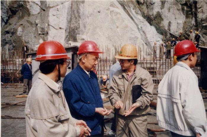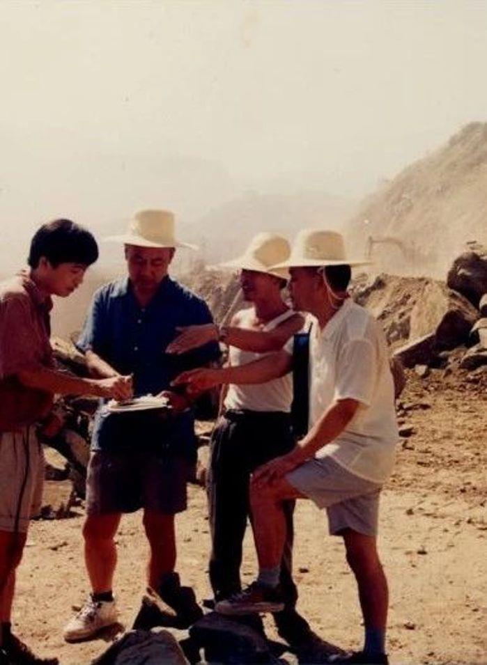 1994年,導流明渠右邊坡設計,鄭守仁(左二)與地質人員在現(xiàn)場研究危巖體處理