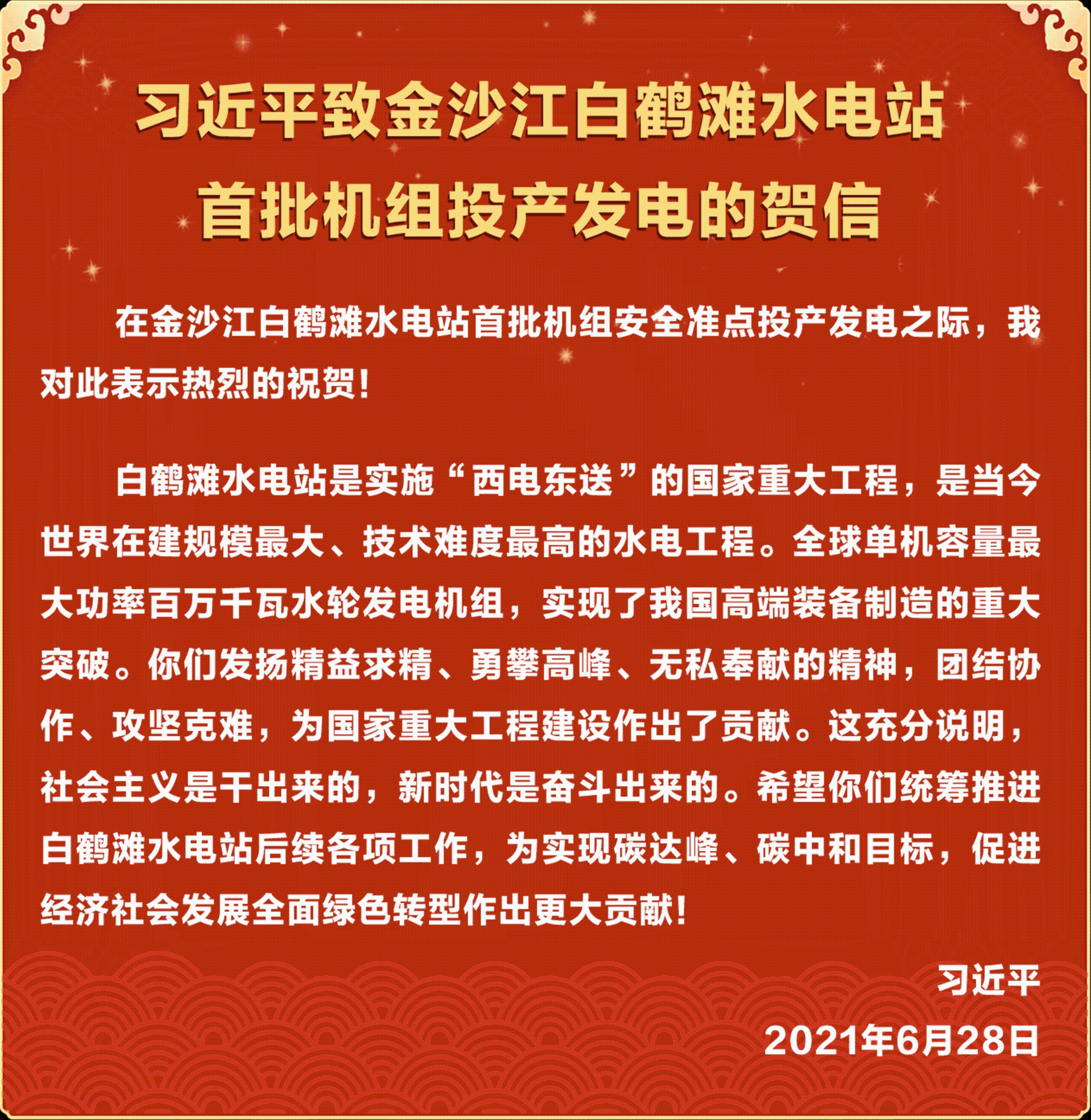 新華社北京6月28日電 金沙江白鶴灘水電站首批機(jī)組于28日安全準(zhǔn)點(diǎn)投產(chǎn)發(fā)電。中共中央總書記、國(guó)家主席、中央軍委主席習(xí)近平發(fā)來賀信,表示熱烈的祝賀。[詳情]