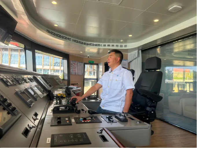 ▲?曾擔任過總船長的湖北三峽旅游集團葉勇在船舶駕駛室。攝影:黃欣