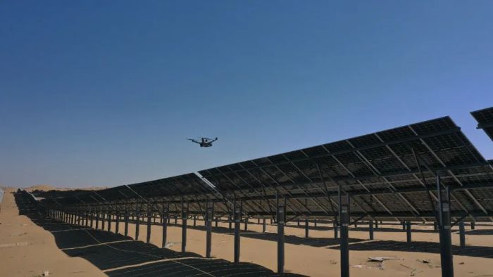先導光儲電站地處內蒙古庫布其沙漠腹地,總裝機容量100萬千瓦,于2023年12月29日全容量并網發電。項目占地面積達3.2萬畝,相當于3000個標準足球場大小。廣闊的面積加上場區錯綜復雜的內部道路,極大增加了電站運維人員巡檢的難度。